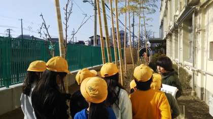 グループごとに分かれて、校内にある木々や植物について一つ一つ生態や特徴についてお話しいただきました。