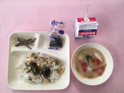 今日の献立は、れんこんのちらしずし、ぞう煮、ごまめ、牛乳 です。正月の行事献立です。
