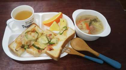 今日の朝ごはんやさんのはアツアツのチーズがたっぷりのったピザトーストに具だくさんのアツアツスープ。