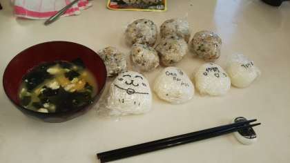 ごはんとお味噌汁づくり、鍋で炊くごはんは難しいですが、火加減に注意しながら炊き上げていきました。おにぎりにしたり、おこげは少し醤油をたして焼きおにぎり風にしたりしました。お味噌汁は、昆布や鰹節でだしを取りました。とてもいい出汁が出ていましたよ!