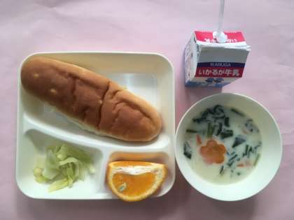 今日の献立は、ほうれん草のクリームシチュー、キャベツのサラダ、いよかん、おさつパン、牛乳 です。