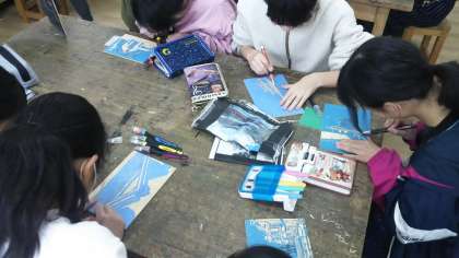 今回は風景画をテーマに作品をつくっています。写真をもとに下書きをし、掘り進めていきます。