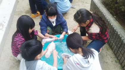 5時間目に、1年生全員が自分の上ぐつを洗っていました。