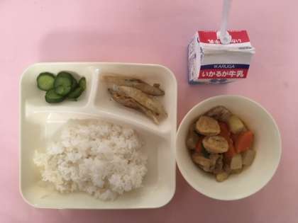今日の献立は、きびなごてんぷら、一口がんもとだいこんの煮もの、あっさりきゅうり、ご飯、牛乳 です。