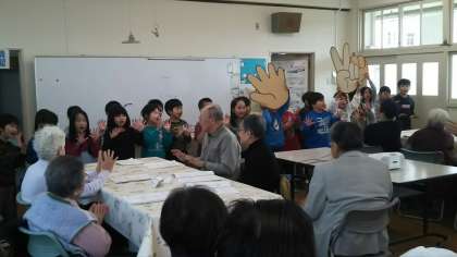 先日のグローバルフェスタで発表した歌を披露し、最後は肩たたきをして、利用者の方々との交流を深めました。