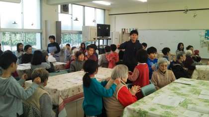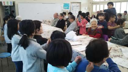食事サービスを利用している方々との交流、今日は2年2組の子どもたちが家庭科室にやってきました。