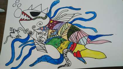 絵の具、パス、色鉛筆を使い分けて色付けをしています。