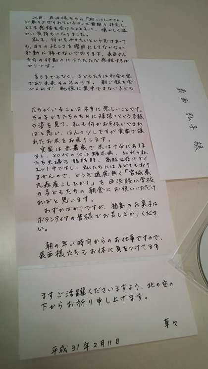 「子どもたちのために頑張っている皆様の姿を見て、私も何かお手伝いできればと思い、実家で採れたお米をお送りします…」