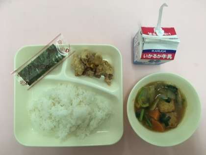 今日の献立は、あげ鶏のねぎソースかけ、あつあげとはくさいの中華煮、焼きのり、ご飯、牛乳 です。