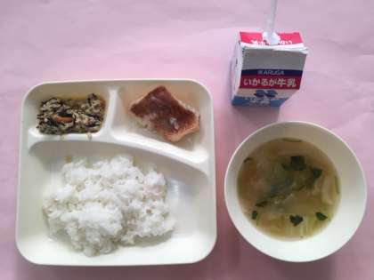 今日の献立は、赤魚のレモンじょうゆかけ、うすくず汁、高野どうふのいり煮、ご飯、牛乳 です。