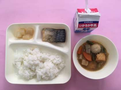 今日の献立は、さばの塩焼き、あつあげとさといもの煮もの、だいこんのみそ煮、ご飯、牛乳 です。