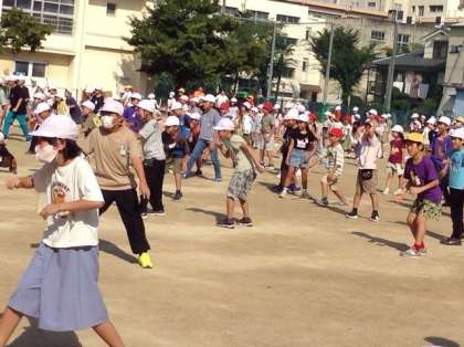 今日はたてわり班でゲーム集会を行いました。運動場で、だるまさんがころんだをしています。子どもたちが多すぎて、誰が動いているのか分かりません。子どもたちは楽しそうにしていますが。。。