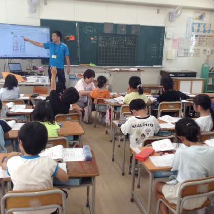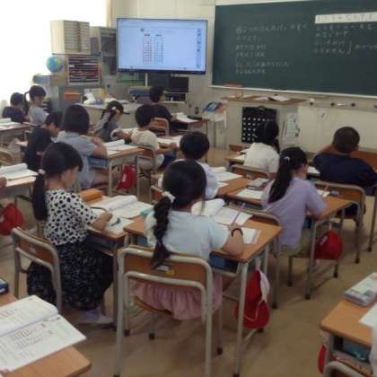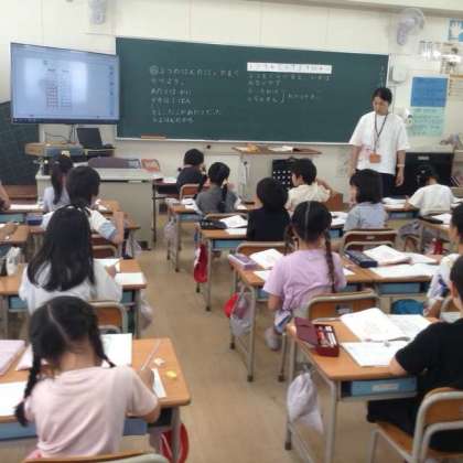 1年生は数を比べる学習をしています。表に色をぬり、いつく多い、いくつ少ないと比べる学習です。丁寧に色をぬって、数えまちがえないようにします。静かに学習しています。