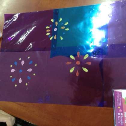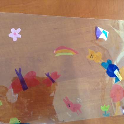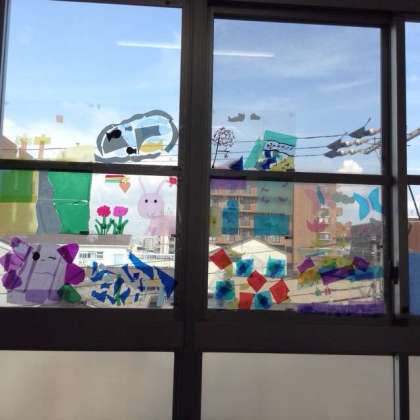 4年生は行ってみたいな光の世界というテーマで工作をしています。カラーセロハンを使って自分がイメージした世界を表現しています。窓に貼ると、光が当たってとてもきれいです。細かい模様も丁寧に切り貼りして作っています。