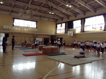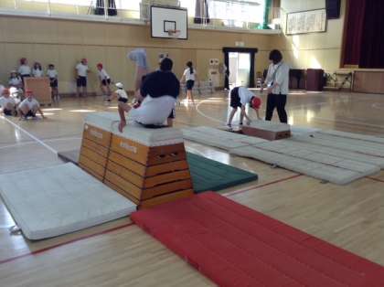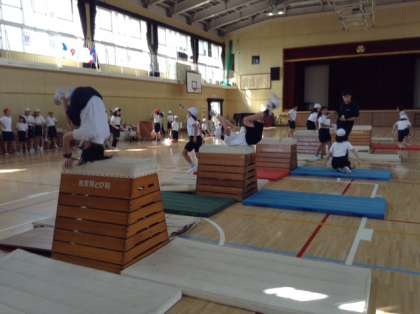 4年生は台上前転に挑戦しています。台の高さや長さをセットして、自分が挑戦しやすいコースから取り組んでいます。高さがあると不安を感じる子もいますが、補助をしてもらいながらがんばっています。みんな助走から真剣な表情で挑んでいました。