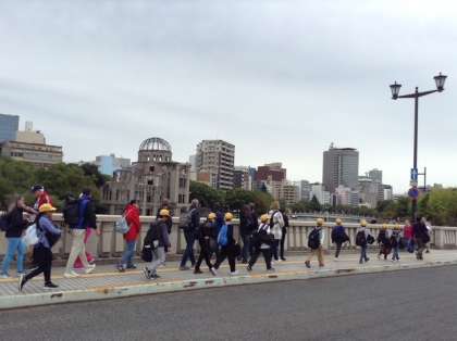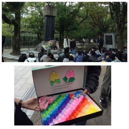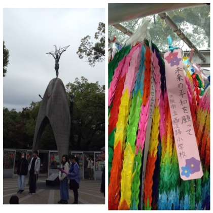 広島平和記念公園に着きました。曇り空で少し肌寒いですがみんな元気です。原爆の子の像と韓国朝鮮人慰霊碑で平和の集いを行いました。西淡路小学校のみんなで折った千羽鶴と亀を捧げ、未来の平和を祈りました。今から昼食を食べ資料館へ入ります。