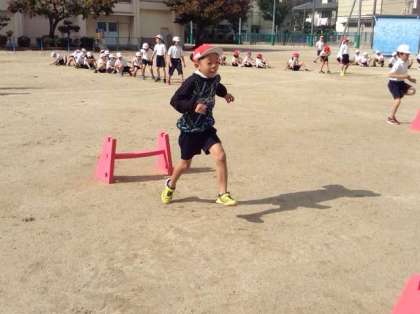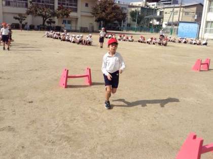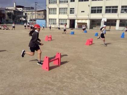 3年生はハードル走をしました。ミニハードルを並べて走っています。間を決まった歩数でリズムよく走り抜けていきます。軽いハードルを使っているので当たっても安全です。