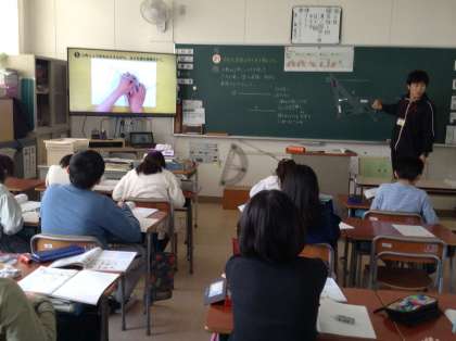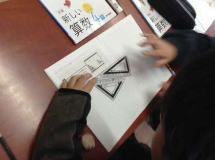 4年生は図形の学習をしています。三角定規を使って平行な直線をかいています。上手くスライドさせて、ずれないように作図していました。方法を忘れないように家でも練習してみましょう。