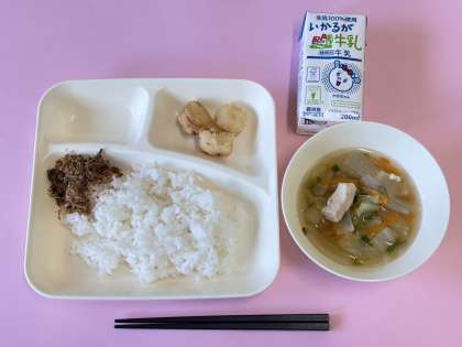 今日のいかてんぷらは、いかに小麦粉とでんぷんで作った衣がついたものを給食室であげています。