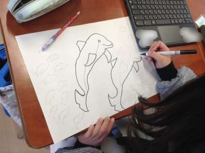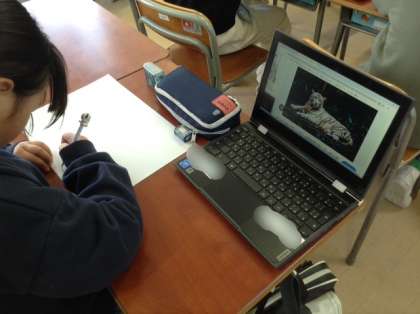4年生は木版画に挑戦します。今日は版画のデザインを考えています。好きな動物をタブレットで調べて下絵を描いています。とても細かい模様を描いている子もいます。上手く彫れるように頑張ってほしいです。