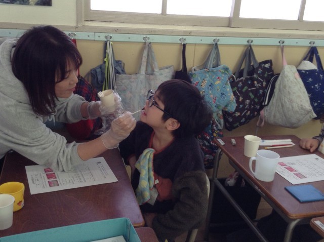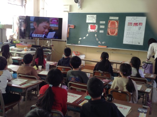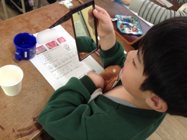 2年生は歯科衛生士さんにお越しいただき、正しい歯みがきの仕方を教えていただきました。映像で方法を確認して、実際に歯ブラシで磨いています。自分の歯1本にピンク色の染め液を塗り、汚れが落とせているか確認します。正しく磨けていると、歯は白色に戻ります。ご家庭でも教わった歯みがきを試してみてください。