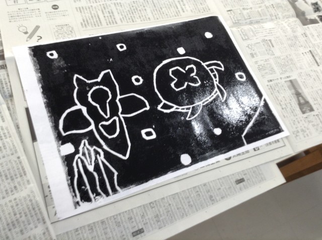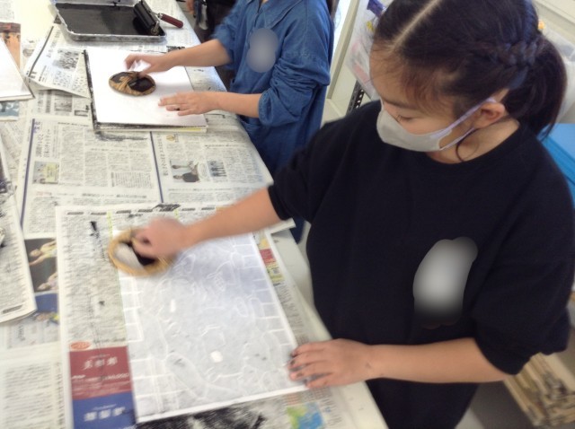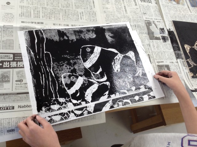 4年生は木版画が完成しました。今日はインクをのせて刷っていきます。上手く模様が出てきれいな作品が完成しました。参観日の時にご覧ください。