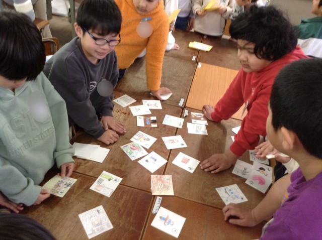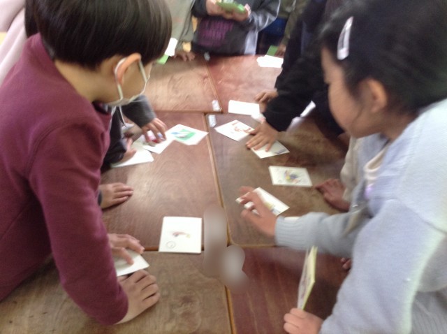 2年生はカルタ大会をしています。子どもたちが言葉を考えて作ったオリジナルのカルタです。「金魚だと思ったらメダカだった」の『き』・・・ユニークなカルタが多くて楽しいですよ。
