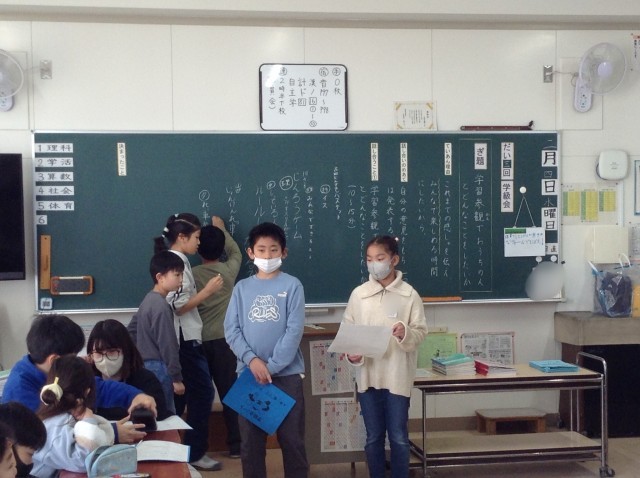 4年生は学活「学習参観でおうちの人とどんなことをしたいか」という議題で話し合いをしました。出た意見を元にどうすれば実行できるかをみんなで考え、協力できるような話し合いになるように進めていました。感謝を伝えみんなで楽しめる参観にしたいそうです。がんばってください!
