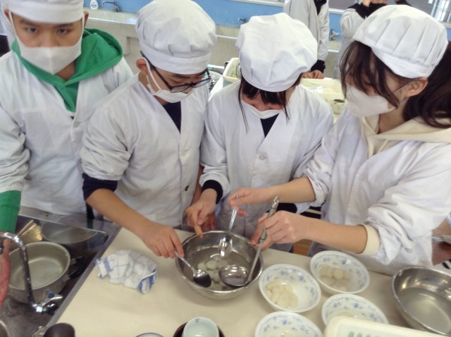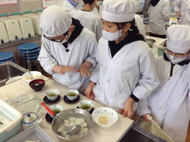 今日は2組が調理実習を行いました。白玉団子とお茶でホッとするひと時を過ごしました。材料の分量を間違わないように確認しながら作業を進めています。美味しそうにできあがりました。みんなでホッとする時間です。いつもは厳しい先生も団子の前ではにこやかです。
