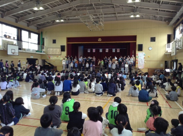 今日は卒業生を祝う会でした。この日に向けて児童会の子どもたち、1年生〜5年生はお祝いの準備をしてきました。入場の時大きな拍手で迎えられる卒業生。とてもはずかしそうにしていましたが、ゲームをして盛り上がり、みんな楽しい時間を過ごしました。