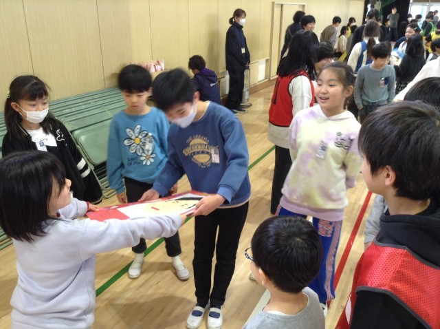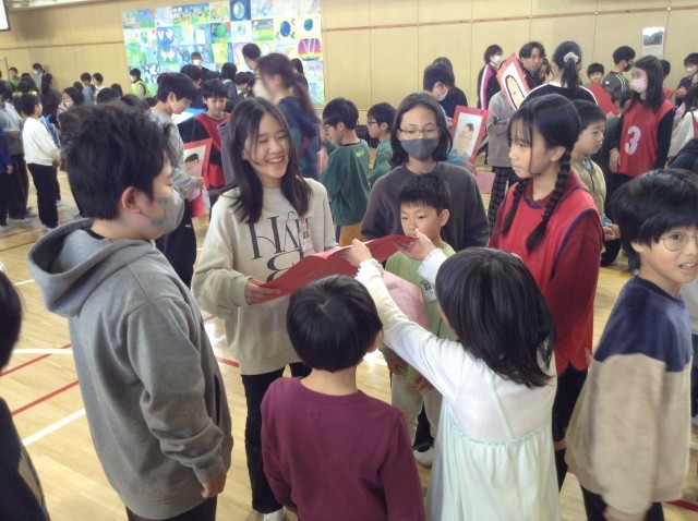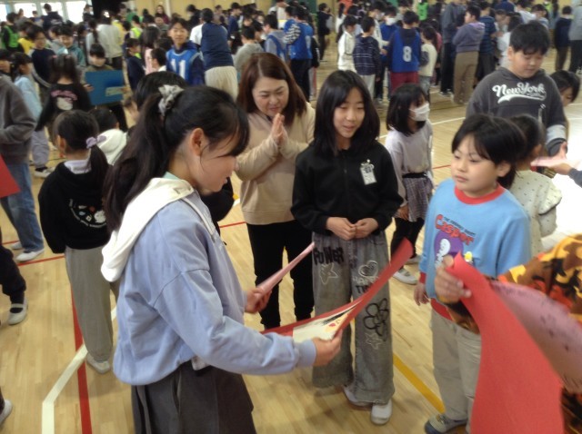 在校生からのプレゼントはみんなで一生懸命描いた似顔絵とメッセージです。6年生もとても嬉しそうでした。