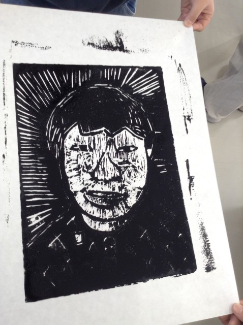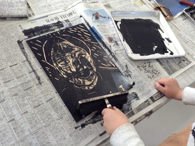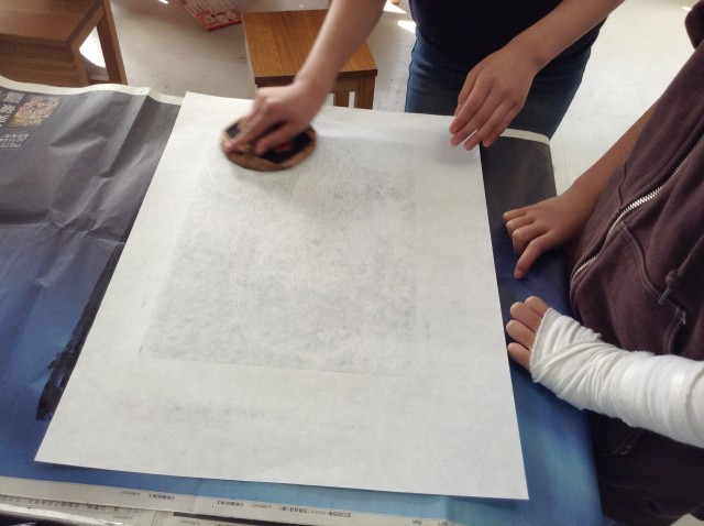5年生は自分の似顔絵を写しとり木版画を彫刻刀で彫ったものを、本日紙に刷りました。友だちと一緒に紙がずれないようおさえながら刷ることができました。