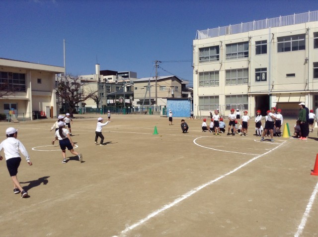 2年生は運動場でベースボール型ゲームを楽しんでいます。ボールを打つ代わりに、投げて飛ばします。守備の子どもたちがボールをキャッチする間にコーンまで走ります。点数を競いながら運動を楽しんでいます。