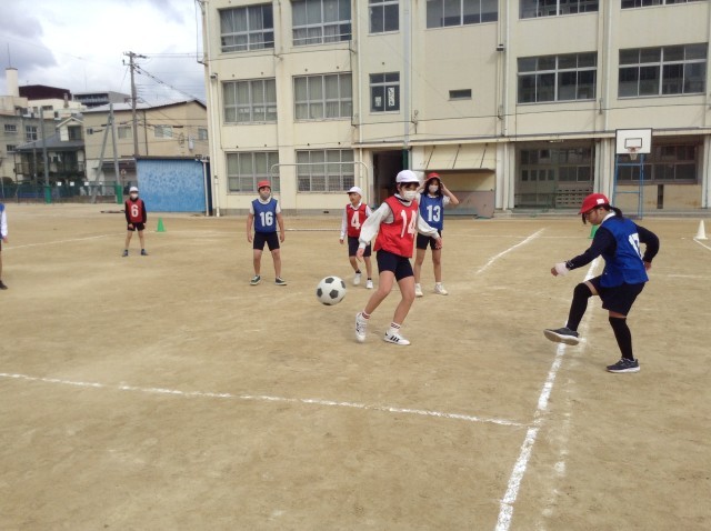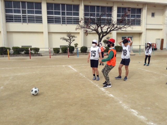 5年生は運動場でサッカーをしています。今日は寒かったので走って体を温めています。上手くなってきたのかな?ゲームは盛り上がっています。