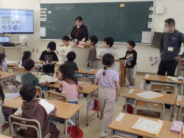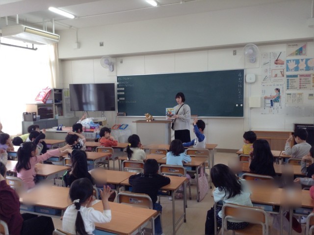 今日は絵本の読み聞かせを聞いたり、初めてお友だちにノートを配る郵便屋さんをしたりする姿が見られました。チャイムの音を聞いて休み時間を終えて教室へ帰ることにも慣れてきたようです。