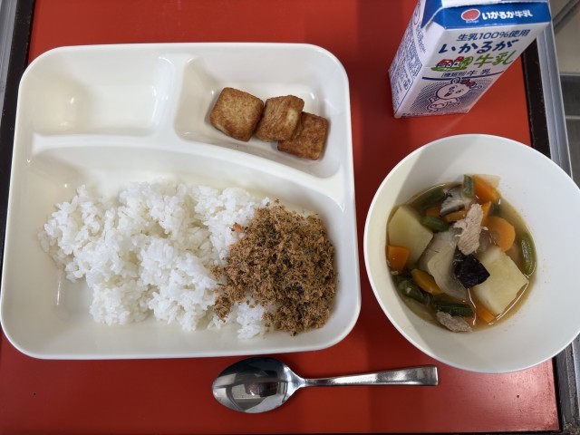 鶏肉とじゃがいもの煮もの、あつあげのしょうゆだれかけ、紅鮭そぼろ、ごはん、牛乳