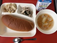 今日の献立は黒糖パン、牛乳、豚肉のガーリック焼き、スープ、ツナとキャベツのソテーです。給食当番のお仕事を頑張っています。見本をたしかめてきれいに盛りつけたり、正しい食器の並べ方についても学んでいます。