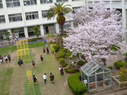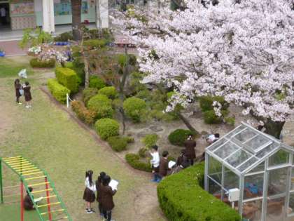 写っている子どもたちは、理科で春を観察している3年生です。例年ならすっかり葉桜になっているころですので、今年の3年生はラッキーですね。