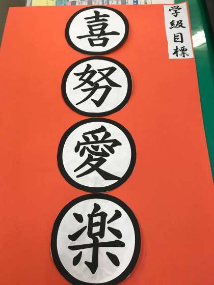 「喜努愛楽(きどあいらく」です。この言葉には、「共に喜び、共に努力し、共にクラスを愛し、楽しい1年にしよう」という意味がこめられています。具体的にどう行動すればこの目標を達成することができるのかもみんなで話し合いました。