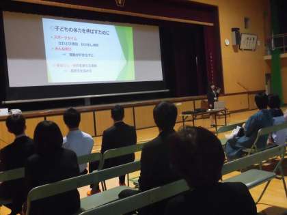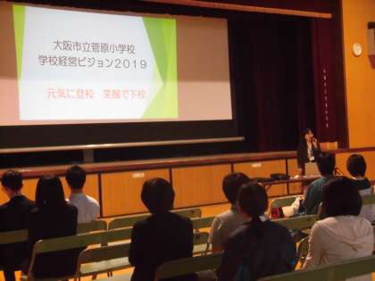 学習参観・学級懇談会後の全体懇談会では、菅原小学校の1年間の教育の取組内容について説明させていただきました。