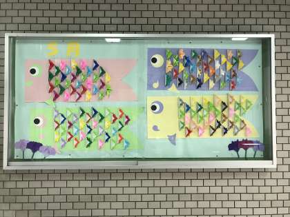 5月の玄関前掲示ができました。鯉のぼり達がゴールデンウィーク明け、元気に登校してくる子どもたちを待っています♪♪