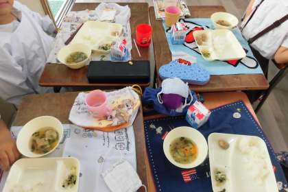 給食は生活班でみんな仲良く食べてます!