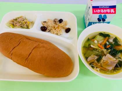 今日は、もち米のほかに鶏肉やしめじ、金時豆が入ったおこわでした。