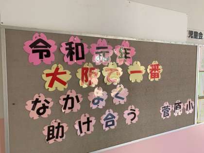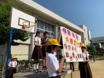 今年度の学校のめあてを運営委員会の児童が発表しました。6年生はの代表児童は、下級生の手本となって立派な姿を見せることができました。