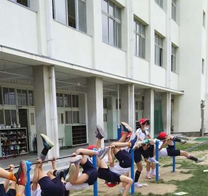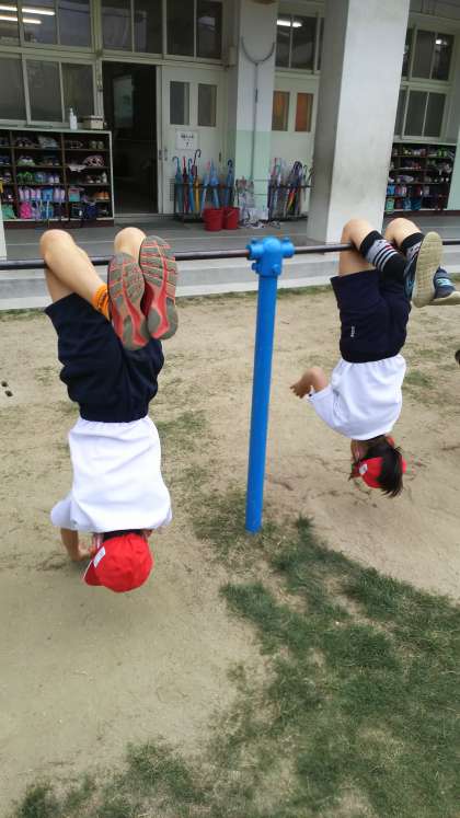 体育では鉄棒もしています。教科書に載っている技を見て新しい技に挑戦したり、「四年生でできるようになった!」と習っていた技ができるようになったりしていました。