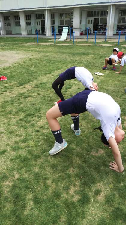 青々とした芝生の上でブリッジにも挑戦する子もいました。