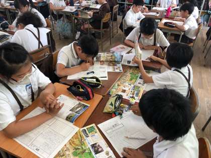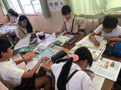 資料集を見たり、友だちと相談したりしながら一生懸命取り組んでいます。