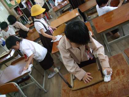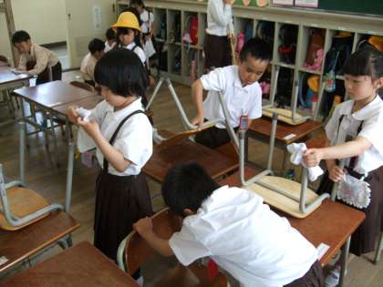 雑巾の絞り方、机やいすの拭き方、雑巾の洗い方まで、練習しながら掃除をしました。