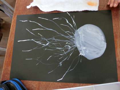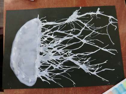 みんなとても素敵なくらげになりました。次の時間には、綿棒を使って模様を描いていきます!