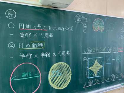 現在取り組んでいる内容です。複合図形ともなるとなかなか難しいですね。このように図に色をつけたり、考え方を書き込んだりして粘り強く取り組んでほしいと思います。